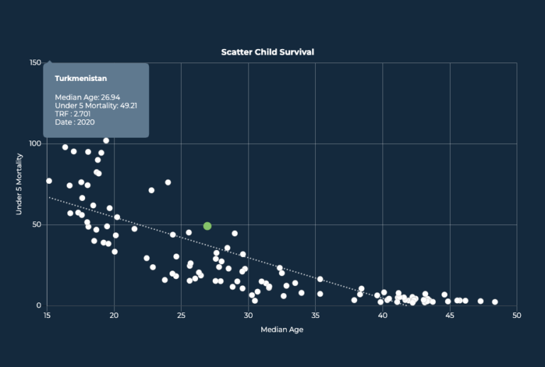 - A country becomes more than 50 percent likely to achieve the child health benchmark, measured by a mortality rate of children under age 5 less than or equal to 25 deaths per 1,000 live births, when the median age of the population reaches 27 years.